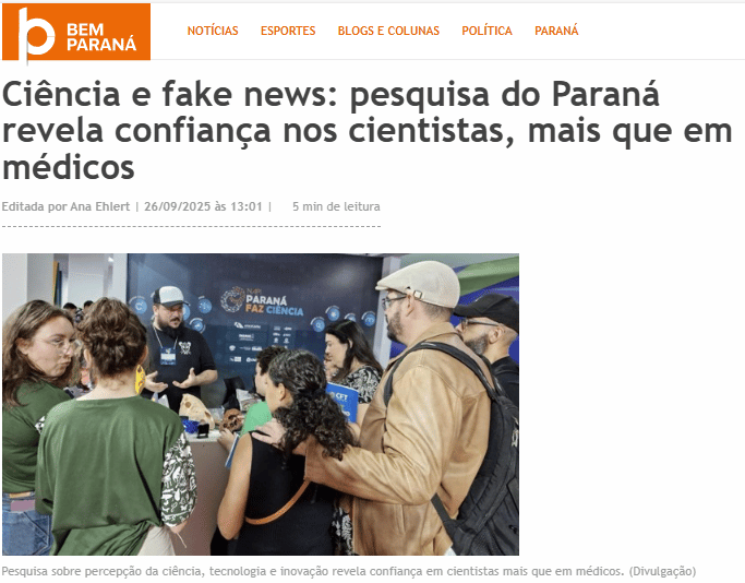![]() Reprodução RPC BOM DIA PARANÁ O professor Angelo Parise, do Departamento de Zoologia, fez uma rica participação no programa Bom dia Paraná, da TV RPC, sobre cuidados na prevenção de acidentes com animais peçonhentos. | ![]() Reprodução Portal Bem Paraná BEM PARANÁ No dia 30 de setembro, foi lançada a primeira Pesquisa Estadual de Percepção Pública da Ciência, Tecnologia e Inovação (CT&I) no Paraná, coordenada pelo NAPI Paraná Faz Ciência com apoio da Fundação Araucária e SETI. |