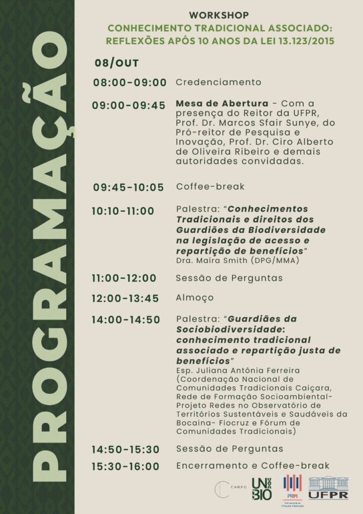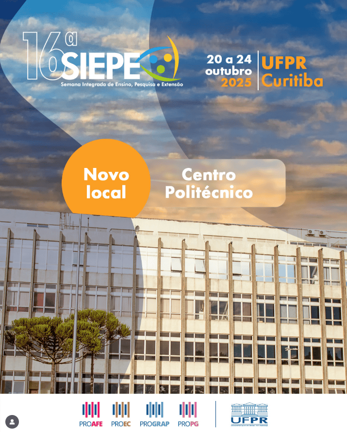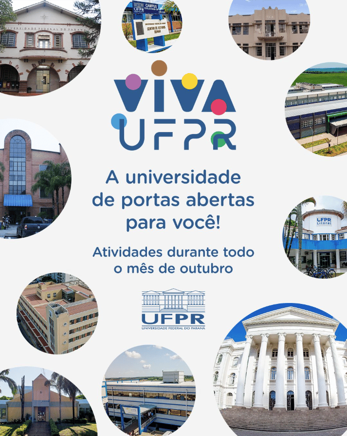 ![]() WORKSHOP Entre 8 e 9 de outubro, a UFPR receberá o workshop “Conhecimento Tradicional Associado: reflexões após 10 anos da Lei 13.123/2015”, voltado à realização da discussão sobre os avanços e desafios da Lei 13.123. O evento será realizado no Centro Politécnico da UFPR, no Auditório II do Departamento de Engenharia Química. Inscrições encerradas. | ![]() VIVA UFPR! No mês de outubro de 2025, a UFPR abre as portas para que a comunidade externa conheça os espaços, projetos, programas, laboratórios, serviços e iniciativas que envolvem ensino, pesquisa, extensão e cultura. O evento VIVA UFPR promove uma programação aberta à comunidade externa que culmina com a 16ª edição da SIEPE, momento de fundamental importância para a instituição. |