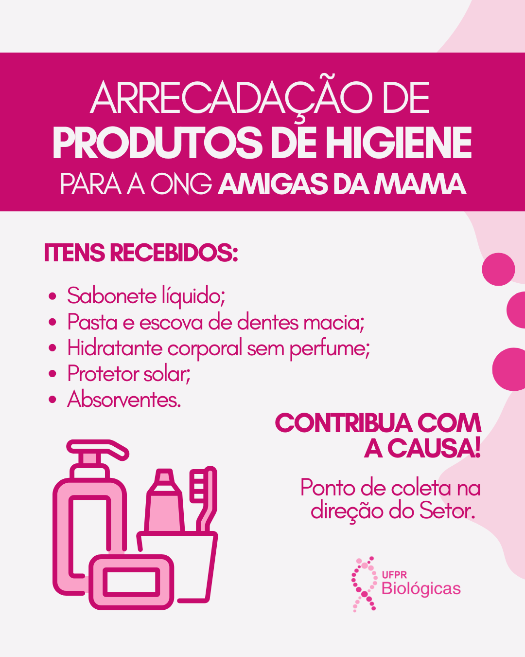 ![]() | CAMPANHA OUTUBRO ROSA Neste Outubro Rosa, o Biológicas estará coletando doações de produtos de higiene para a ONG Amigas da Mama. Para participar, basta deixar sua doação na caixa disponível na sala da Direção do Setor. Convidamos a todos a fortalecer essa iniciativa tão importante! |