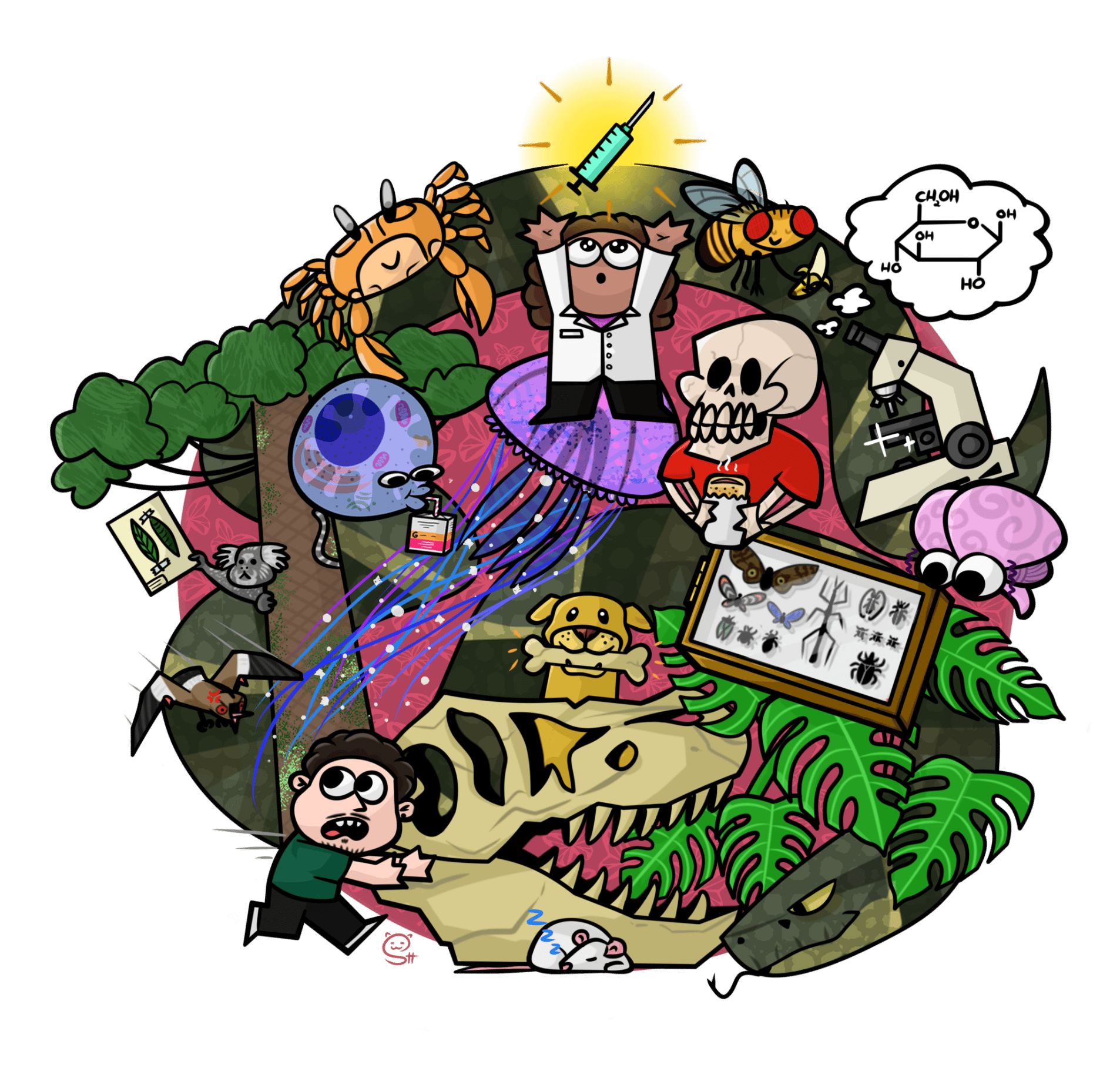 Em 2024, o Setor de Ciências Biológicas comemorou seus 85 anos com muitas celebrações. Dentre elas, um concurso de ilustrações para estampar a camisa comemorativa da ocasião. Apenas uma ganhou, mas os concorrentes não economizaram em criatividade! Relembre com a gente algumas das artes que se destacaram: essa é do discente Fábio Jacinto Storgatto.
